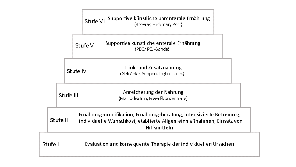 Die ernährungstherapeutische Behandlung erfolgt individuell. Hierzu wird das ernährungstherapeutische Stufenschema nach Löser et al. (2010) herangezogen: