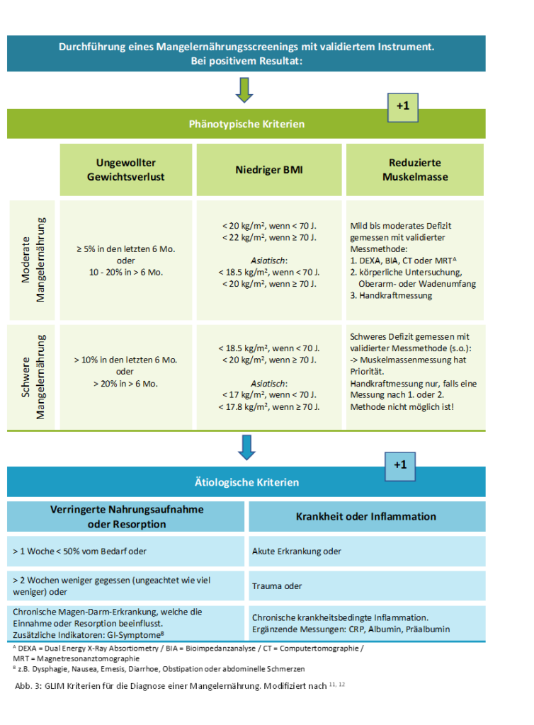 Es gibt verschiedene validierte Screening-Methoden. Im stationären Setting verwenden wir das Nutritional Risk Screening (NRS) sowie das Subjective Global Assessment (SGA). Bei einem positiven Screening werden die im internationalen Konsens beschlossenen, „Global Leadership Initiative on Malnutrition“ (GLIM‑Kriterien) einbezogen.