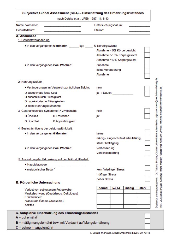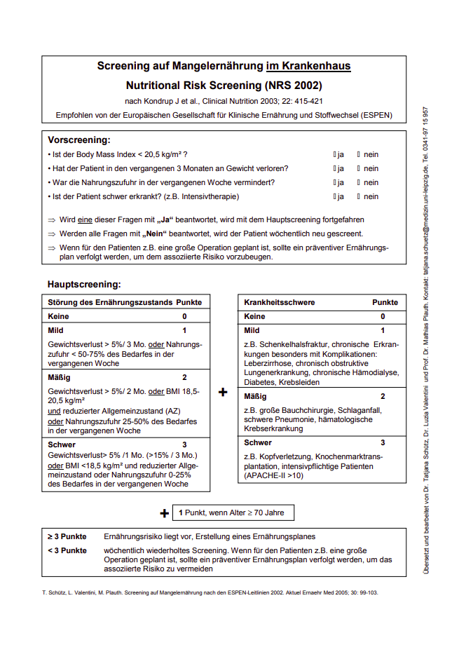 - Ob beim Patienten derzeit kein Risiko für eine Mangelernährung vorliegt; in diesem Falle sollte in regelmäßigen Intervallen eine Re-Evaluierung erfolgen.